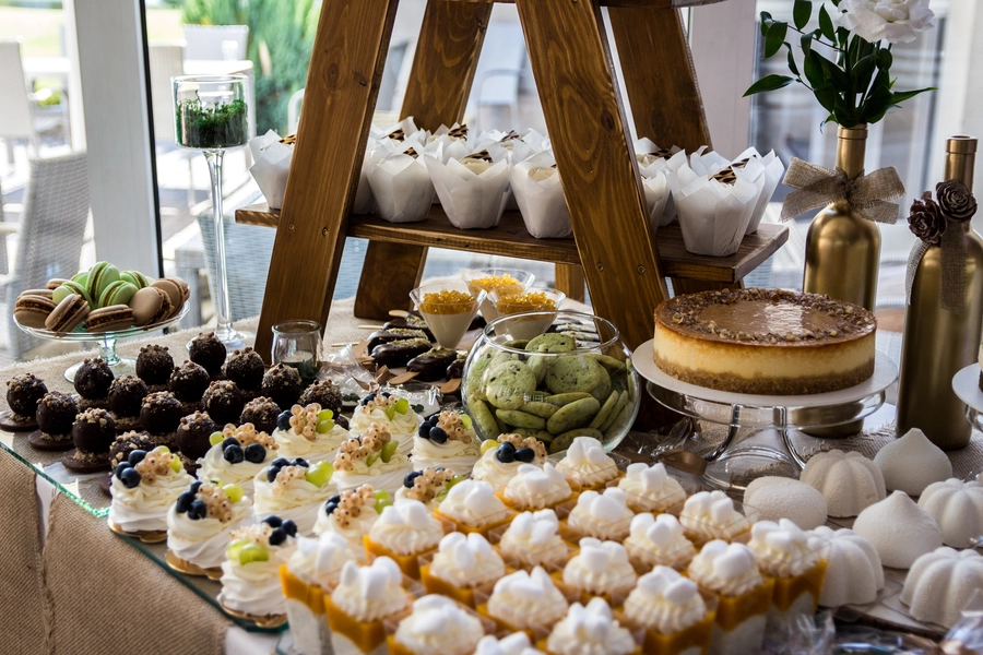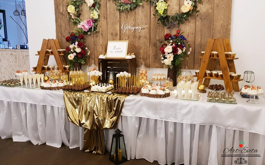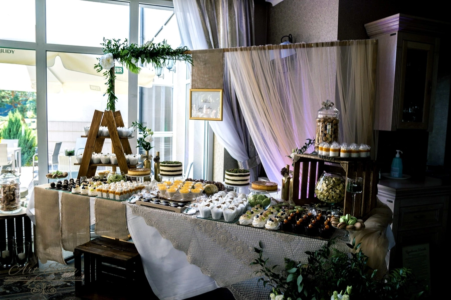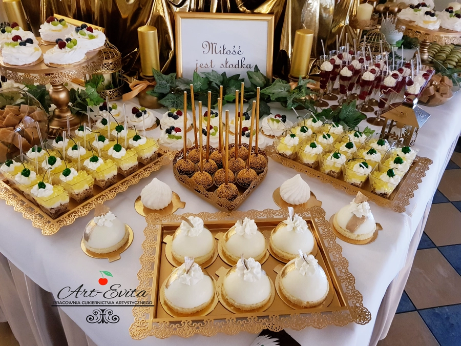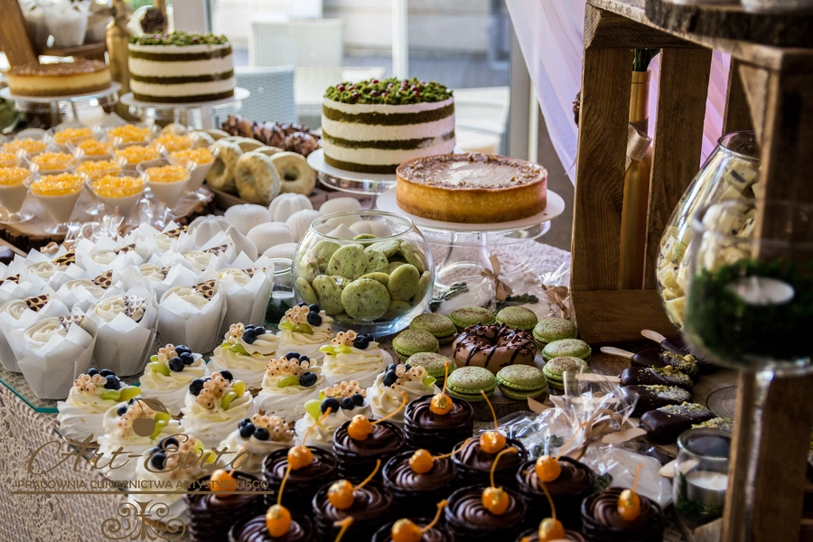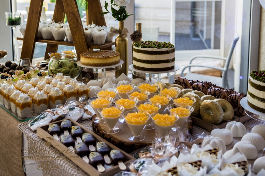 Są to przepięknie skomponowane nowoczesne słodkości w przeróżnych smakach, kolorach, w niewielkich porcjach i pojemnościach, tak aby gość weselny mógł spróbować chociaż kilku sztuk. A jest w czym wybierać! Są to mini deserki, mono porcje, mini pavlove, muffinki, cake popsy (lizaki z ciasta), pop sicles (lody z ciasta), nowoczesne oraz tradycyjne tartaletki, nowoczesne ptysie tzw. shu cakes, lizaczki bezowe, serniki o różnych smakach, tarty oraz wiele innych. Wszystko jest dowożone przeze mnie na salę, rozstawiane i dekorowane, tak aby pasowało do klimatu wesela stylem i kolorystyką.
