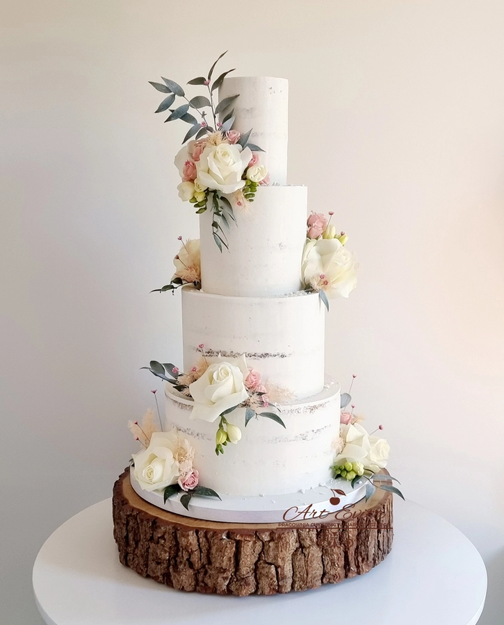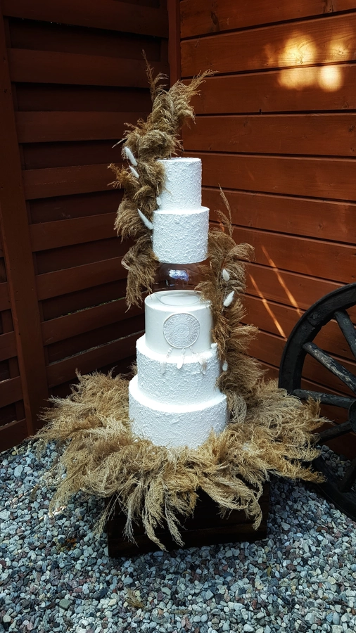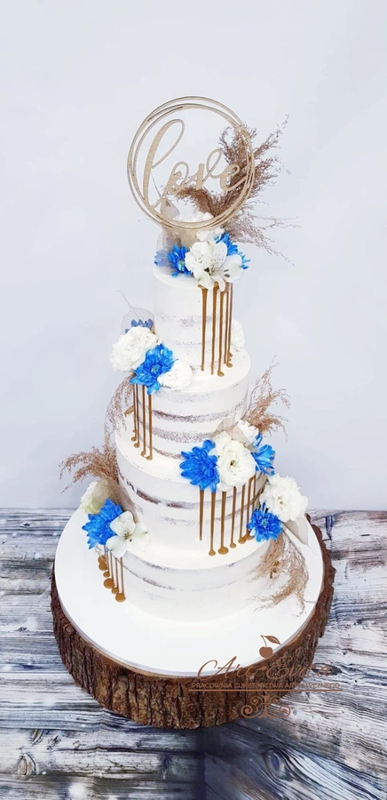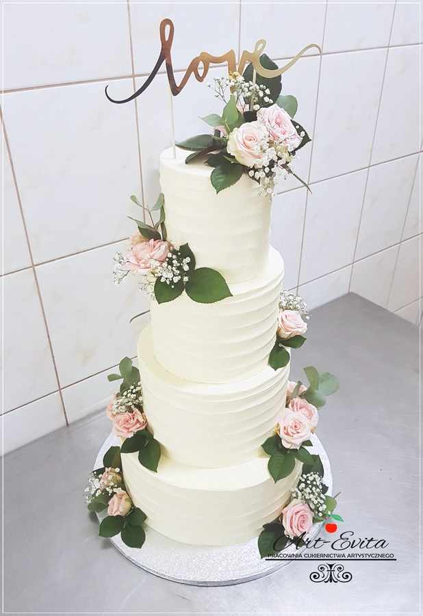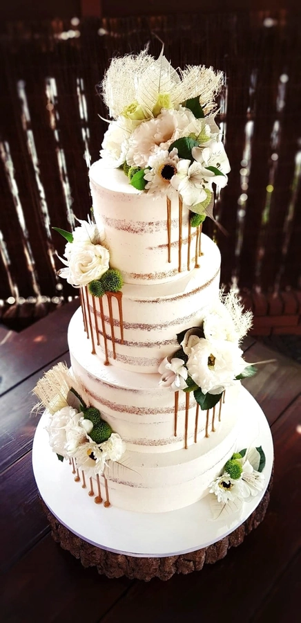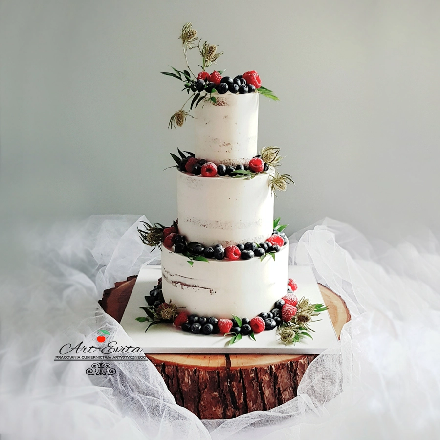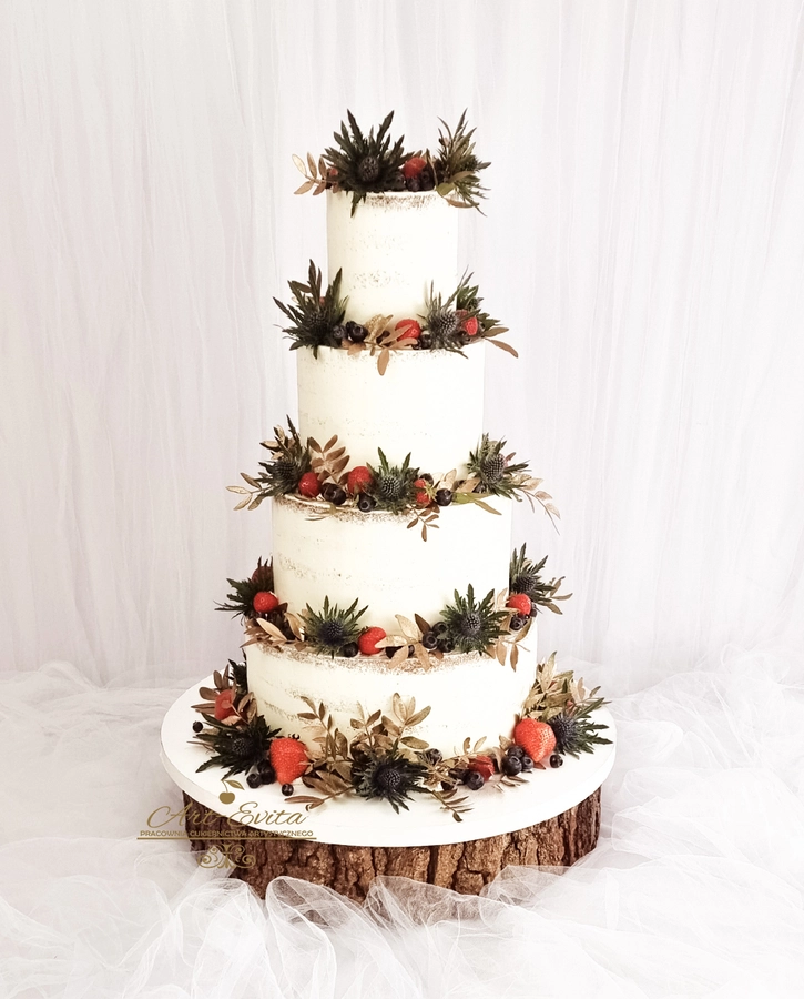 Rustykalne torty weselne wyróżniają się prostotą i elegancją. Zdobione są najczęściej żywymi kwiatami, suszonymi trawami, owocami, delikatnymi listkami czy pastelowymi akcentami, które podkreślają ich naturalny charakter. Każdy element dobieram tak, aby idealnie współgrał z motywem wesela.